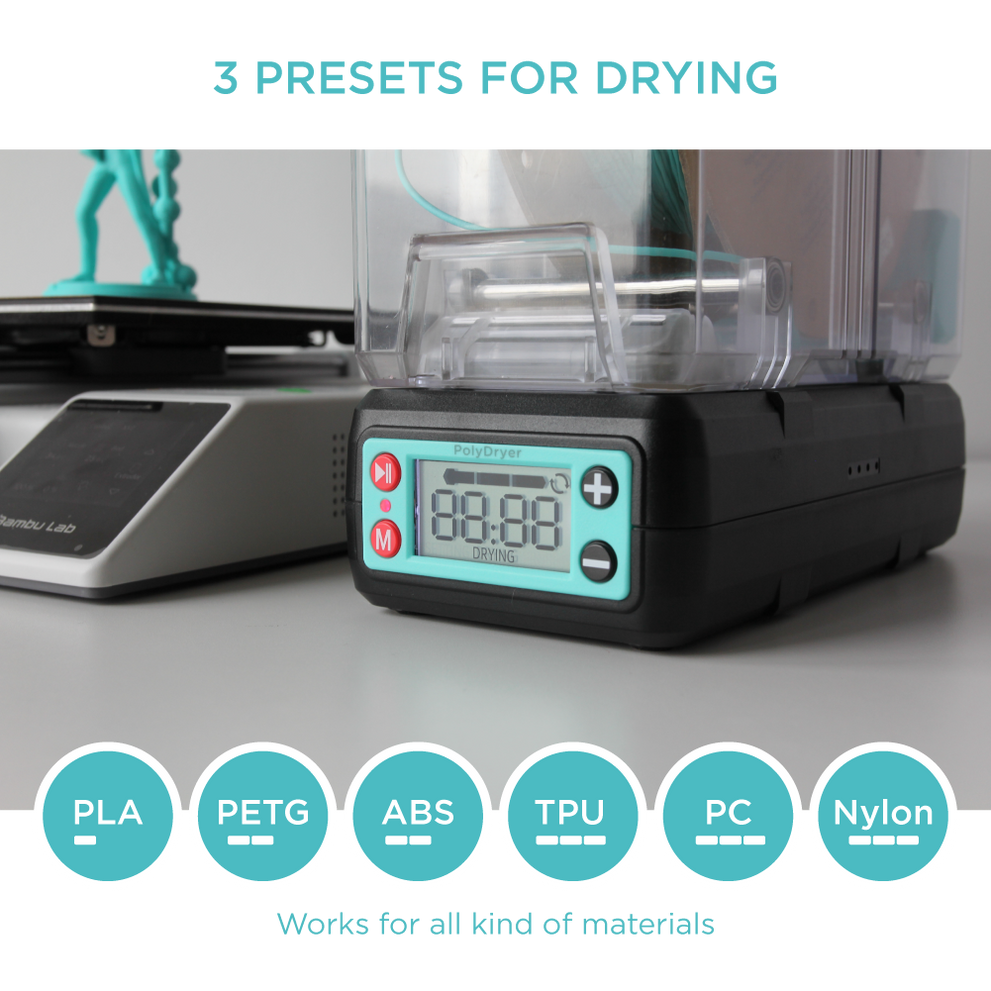 Brings your forgotten spools back to life 360° airflow secures even drying of your spool without damaging it. Compatible with all popular 3D printing materials with 3 preset power levels.